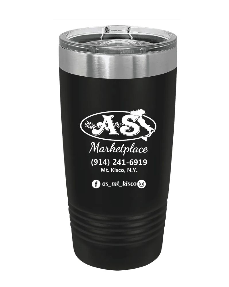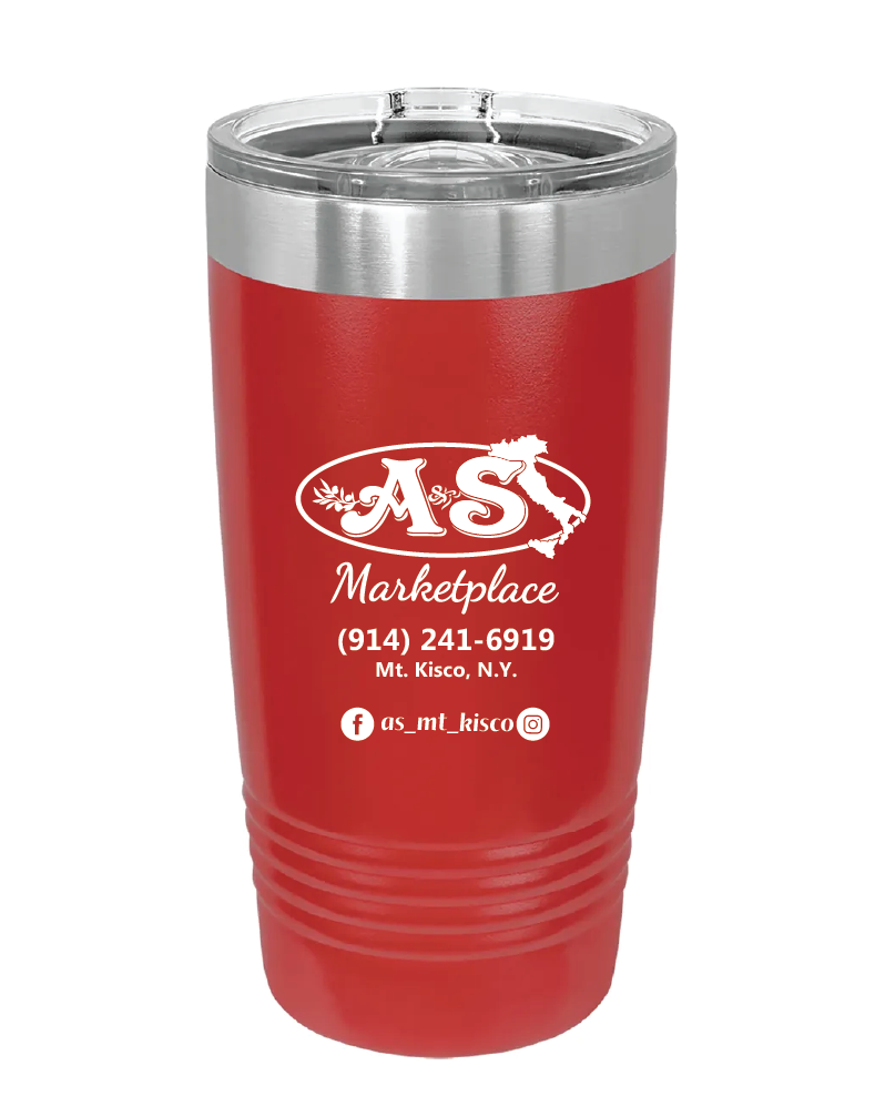 20 oz. stainless steel ringed tumbler with a vacuum sealed, clear-colored lid; includes laser engraved imprint.